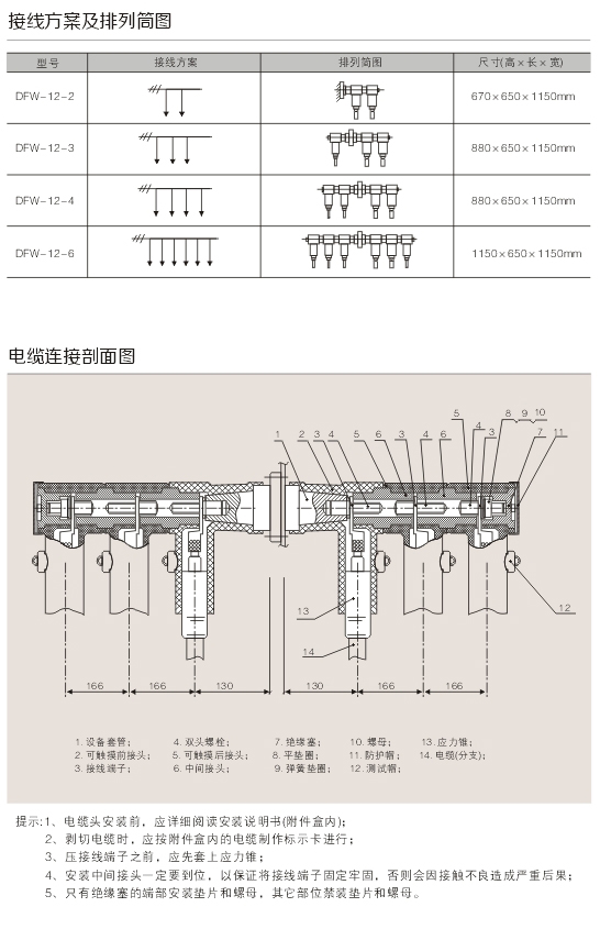 DFW戶外高低壓電纜分授箱系戶外設計、全密封結構,柜體防護等級達IP33,電纜接頭支架采用不銹鋼材料,外殼采用2mm優良不銹鋼制造。箱體內部由電纜倉頂板分隔成母線室和電纜倉兩部分。母線室是由2mm鋼板圍成的密封室。電纜接頭支架位于母線室的上部,用來支撐套管,套管則用來固定電纜接頭,電纜接頭的相間距離為180mm。如果是帶避雷器型,避雷器安裝的電纜接頭的尾…